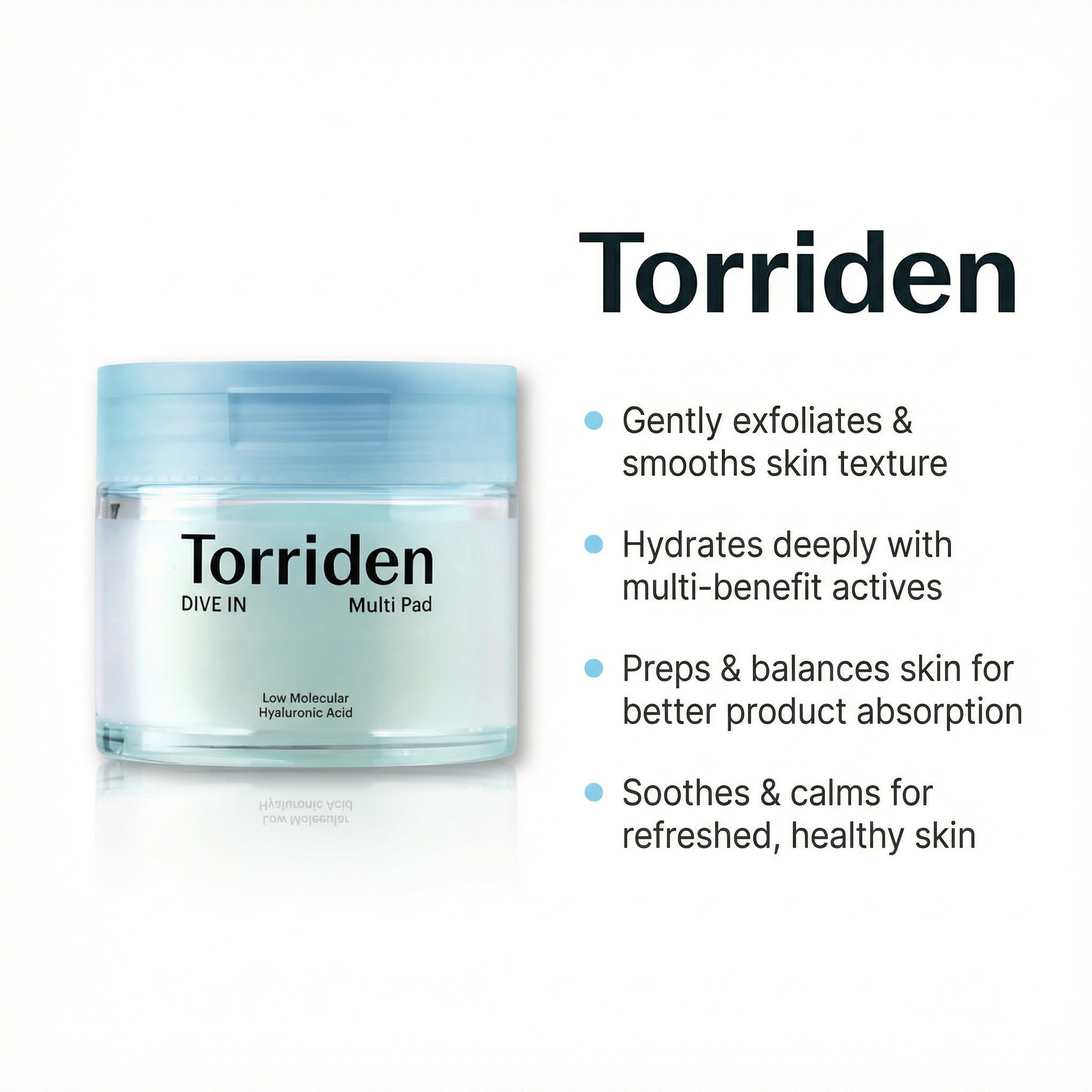 Torriden – DIVE-IN Low Molecular Hyaluronic Acid Multi Pad – pre-soaked, ultra-soft cotton pads formulated for instant moisture and relief. Enriched with a 5D Hyaluronic Acid Complex, these pads help soothe, hydrate and prepare the skin for a luminous, comfortable finish.